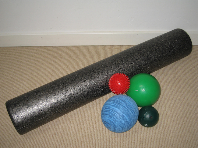 The EVA foam ball (gym blue) is dense, too. It works wonders in the glutes, around the tops of the hamstrings, thighs, middle and upper back and shoulder area. Don’t put it in the lower back or the belly without a trainer present.